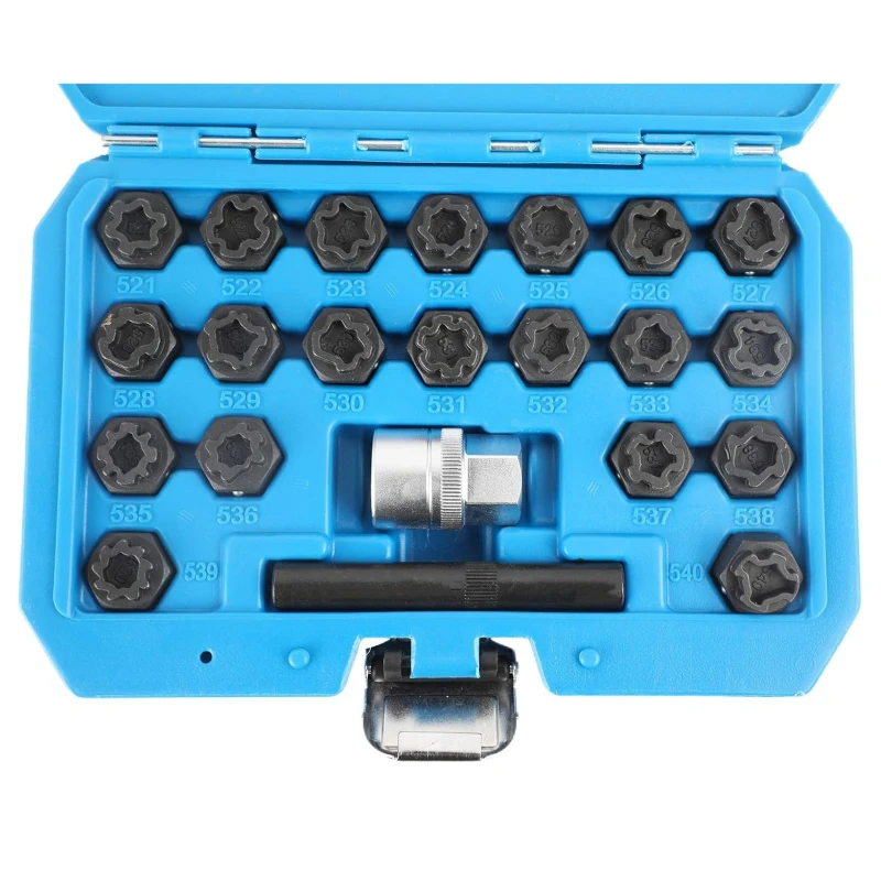 - Kompletan set: Uključuje 20 ključeva jedinstvenih oblika za različite matice, adapter 1/2" (85mm) i alat za izvlačenje za lakši rad u radionicama i garažama.