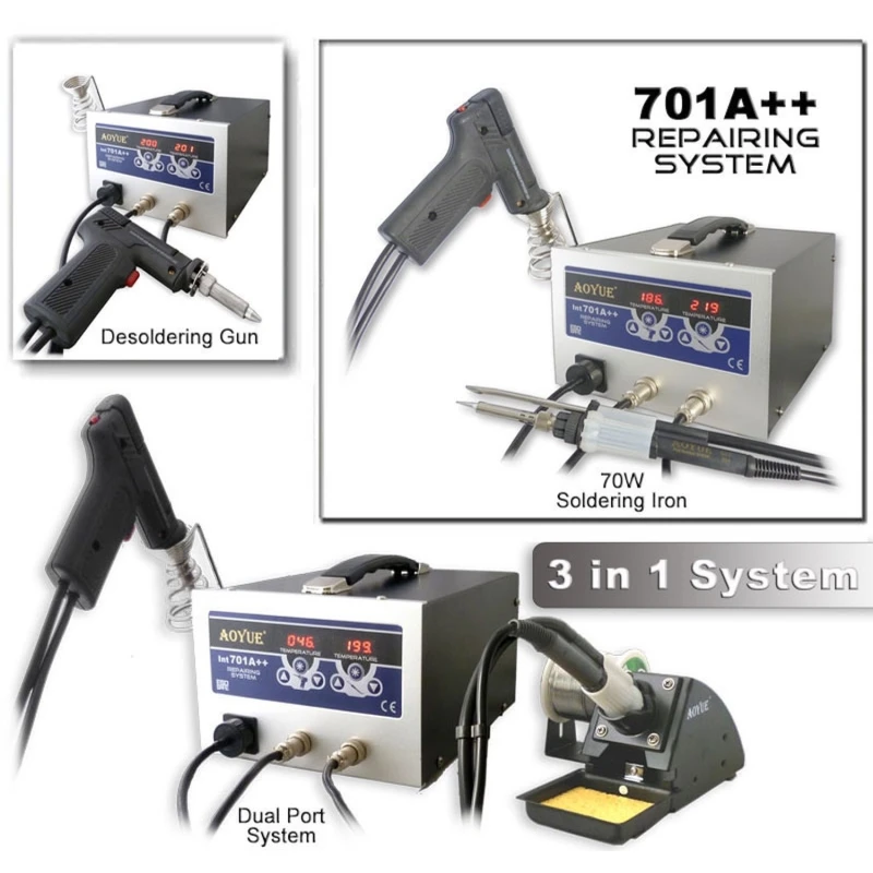 Stanica Aoyue 701A++ integrira lemilicu, odlemljivač i sustav za usisavanje dima u jedan uređaj. To smanjuje zauzeće radnog prostora, olakšava popravke i poboljšava sigurnost filtriranjem štetnih para. U odnosu na korištenje odvojenih uređaja, upravljanje je jednostavnije i učinkovitije, iako specijalizacija svake funkcije može biti veća kod namjenskih uređaja.