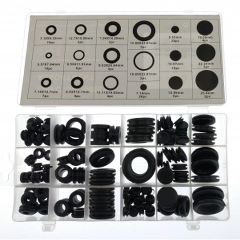 Komplet sadrži uvodnice u 12 mjera, primjerice: 3.18x6.35 mm, 5.57x7.94 mm, 7.14x12.70 mm, do 19.05x23.81 mm, te slijepe čepove u 6 promjera od 7.14 mm do 25.4 mm. Količina po veličini varira; detaljne informacije navedene su u opisu i pokrivaju većinu standardnih otvora na strojevima i pločama.